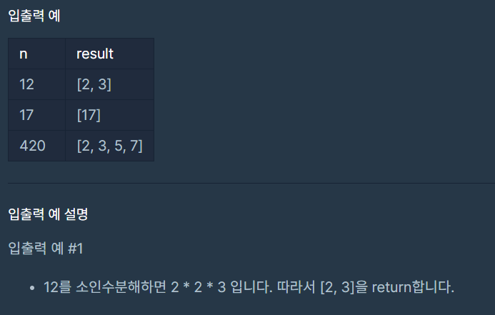 2) 약수 중에서도 소수인 것만 구하기 위해 n % i == 0 일 동안 n /= i 을 해주었다