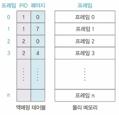 - 다른 매핑들과 반대로 물리 메모리의 프레임 번호를 기준으로 테이블을 구성하는 방법이다