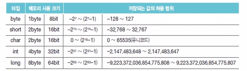 byte, short, int, long은 모두 부호 있는(signed) 정수 타입이므로 최상위 bit는 부호 bit로 사용되고 나머지 bit는 값의 범위를 결정한다.