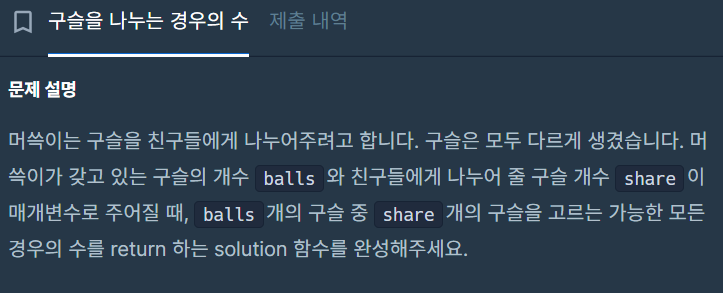 위 문제의 머쓱이가 나누어 줄 구슬은 순서를 고려하지 않아도 되므로 조합에 해당한다.