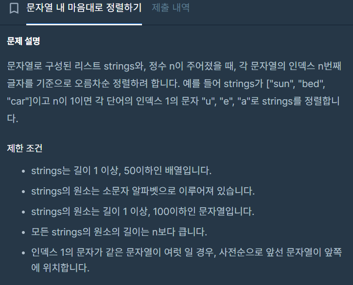 n 번째의 인덱스를 기준으로 알파벳 순서로 정렬해야 하므로 .charAt을 사용해 a와 b의 n번째 인덱스의 아스키코드를 비교하여 정렬하는 람다식을 대입했다. 단, n번째의 아스키코드가 같을 경우에는 compareTo를 사용해 알파벳 순으로 정렬되게 하였다.